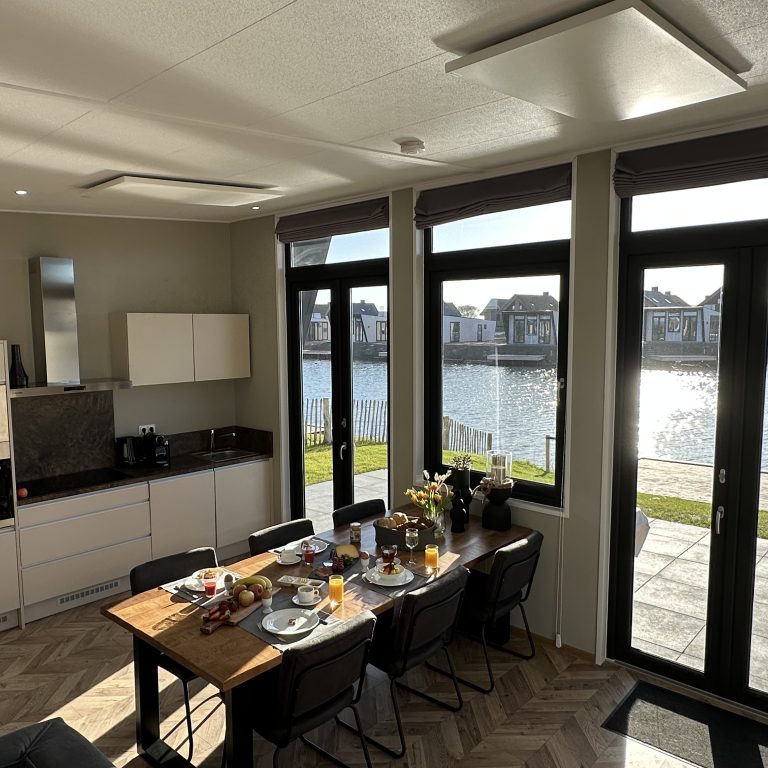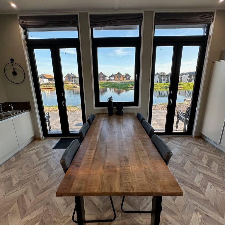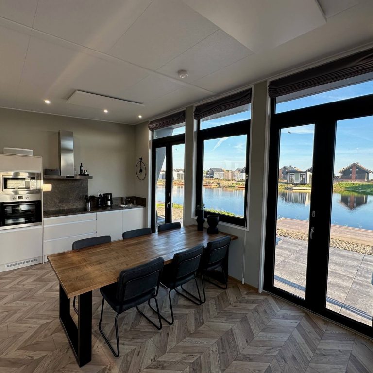 Es erwartet Sie ein Chalet mit großzügigem, modern und freundlich eingerichtetem Wohn-/ Esszimmer und integrierter Küche. Durch die hohe Decke, die extra großen und hohen Fenster entsteht ein lichtdurchfluteter Raum, der zu gemeinsamer Familienzeit, Ausblicken in die Natur und aufs Wasser einlädt. Seien Sie gespannt, welche Tiere sich direkt vom Sofa aus beobachten lassen. Herzstück bildet der große Esstisch mit bequemen Stühlen und das L-Sofa, auf dem man sich herrlich ausruhen, die Beine hochlegen, gemeinsam kuscheln kann und auf dem alle einen Platz finden. Wir haben uns hier ganz bewusst für bequeme, normal hohe Stühle mit Rückenlehnen entschieden, so das auch Kinder und ältere Personen einen angenehmen Sitzplatz haben und uns damit gegen die hier sonst üblichen lehnenlosen Barhocker entschieden. Selbstverständlich können Kinderstühle dazu gebucht werden.