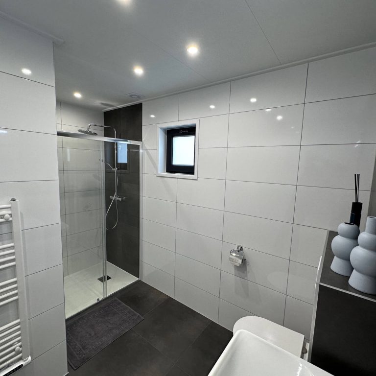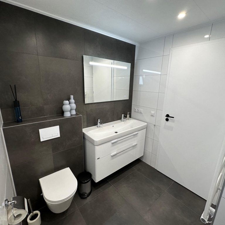 Für einen entspannten Aufenthalt gibt es ein großes, helles Duschbad mit Doppelwaschtisch und 2 großen Schubladen für Ihre Kosmetika, großzügiger, begehbarer Dusche mit Wellness-Rainshower-Duschkopf und Ablage, Toilette und ein weiteres, separates Gäste-WC