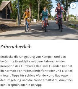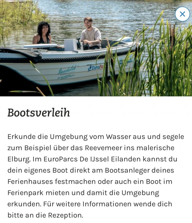 Der EuroParcs wurde ganz neu errichtet, liegt direkt an Reevemeer, Ijsseldelta, IJssel, Randmeren, Ketelmeer, IJsselmeer und Veluwemeer und bietet damit direkten Zugang zu verschiedensten Wassersportmöglichkeiten. Kiten & Surfen in riesigem Stehrevier, Standup-Paddeling, Wasserski & Wakeboard, Segeln, wing-foil-Surfen, Boot fahren – alles direkt vor Ort möglich.